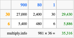 Finally, we add up all the sums we found in step 3 to get our final answer to 981 times 36.
