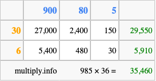 Finally, we add up all the sums we found in step 3 to get our final answer to 985 times 36.