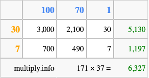 Below is an illustration showing you how to calculate 171 times 37 using the box method, using the instructions above.