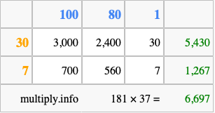 That's all there is to it! As you can see from the box above, the answer to 181 times 37 using the box method is 6,697.