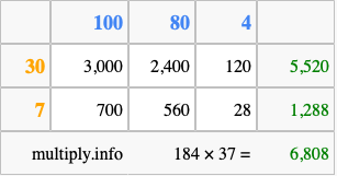 That's all there is to it! As you can see from the box above, the answer to 184 times 37 using the box method is 6,808.