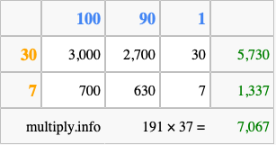 That's all there is to it! As you can see from the box above, the answer to 191 times 37 using the box method is 7,067.
