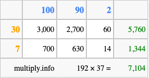 Finally, we add up all the sums we found in step 3 to get our final answer to 192 times 37.