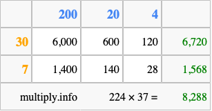 Finally, we add up all the sums we found in step 3 to get our final answer to 224 times 37.