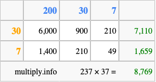 That's all there is to it! As you can see from the box above, the answer to 237 times 37 using the box method is 8,769.