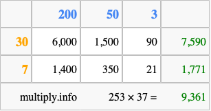 Finally, we add up all the sums we found in step 3 to get our final answer to 253 times 37.