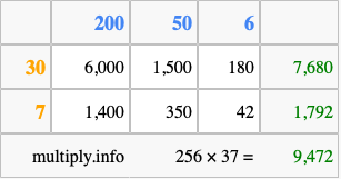 That's all there is to it! As you can see from the box above, the answer to 256 times 37 using the box method is 9,472.