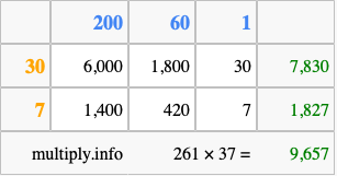 Below is an illustration showing you how to calculate 261 times 37 using the box method, using the instructions above.