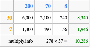 Finally, we add up all the sums we found in step 3 to get our final answer to 278 times 37.