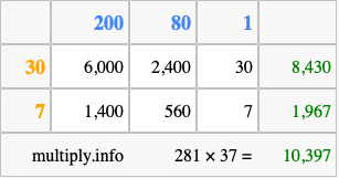 Finally, we add up all the sums we found in step 3 to get our final answer to 281 times 37.