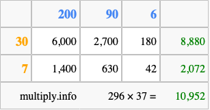 Below is an illustration showing you how to calculate 296 times 37 using the box method, using the instructions above.