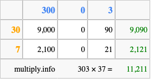 Finally, we add up all the sums we found in step 3 to get our final answer to 303 times 37.