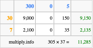 Finally, we add up all the sums we found in step 3 to get our final answer to 305 times 37.