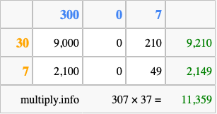 Finally, we add up all the sums we found in step 3 to get our final answer to 307 times 37.