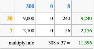 Below is an illustration showing you how to calculate 308 times 37 using the box method, using the instructions above.