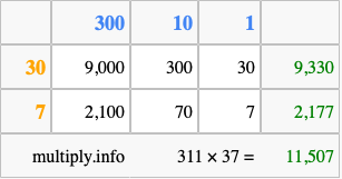 We start by separating 311 and 37 by place value. Then we enter the place values from 311 into the top row of the box, and the place values from 37 into the left column of the box.