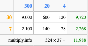 Finally, we add up all the sums we found in step 3 to get our final answer to 324 times 37.