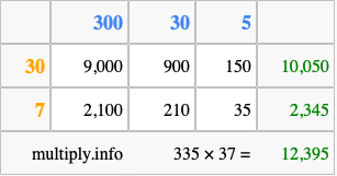 Finally, we add up all the sums we found in step 3 to get our final answer to 335 times 37.