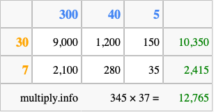 Finally, we add up all the sums we found in step 3 to get our final answer to 345 times 37.