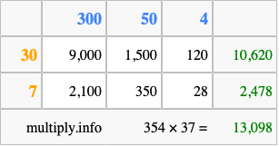 That's all there is to it! As you can see from the box above, the answer to 354 times 37 using the box method is 13,098.