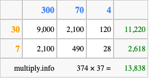 That's all there is to it! As you can see from the box above, the answer to 374 times 37 using the box method is 13,838.