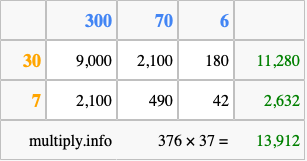 That's all there is to it! As you can see from the box above, the answer to 376 times 37 using the box method is 13,912.