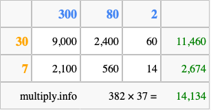 That's all there is to it! As you can see from the box above, the answer to 382 times 37 using the box method is 14,134.