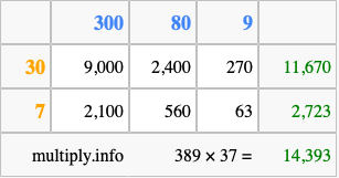 Finally, we add up all the sums we found in step 3 to get our final answer to 389 times 37.