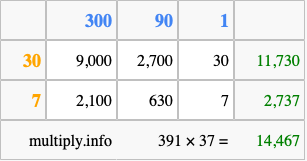 That's all there is to it! As you can see from the box above, the answer to 391 times 37 using the box method is 14,467.