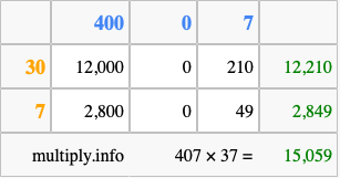 Finally, we add up all the sums we found in step 3 to get our final answer to 407 times 37.