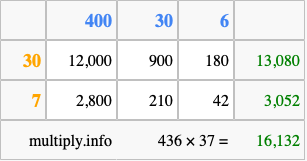 That's all there is to it! As you can see from the box above, the answer to 436 times 37 using the box method is 16,132.