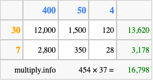 Finally, we add up all the sums we found in step 3 to get our final answer to 454 times 37.