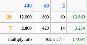 Finally, we add up all the sums we found in step 3 to get our final answer to 462 times 37.