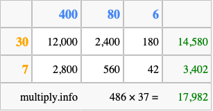 Finally, we add up all the sums we found in step 3 to get our final answer to 486 times 37.