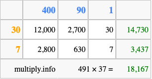 That's all there is to it! As you can see from the box above, the answer to 491 times 37 using the box method is 18,167.
