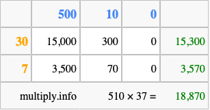 Below is an illustration showing you how to calculate 510 times 37 using the box method, using the instructions above.