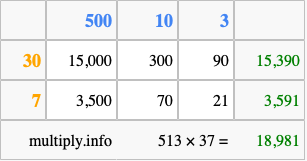 Below is an illustration showing you how to calculate 513 times 37 using the box method, using the instructions above.