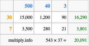 Finally, we add up all the sums we found in step 3 to get our final answer to 543 times 37.