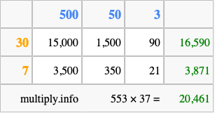 Below is an illustration showing you how to calculate 553 times 37 using the box method, using the instructions above.