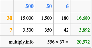 That's all there is to it! As you can see from the box above, the answer to 556 times 37 using the box method is 20,572.