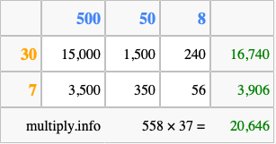 That's all there is to it! As you can see from the box above, the answer to 558 times 37 using the box method is 20,646.