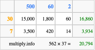 That's all there is to it! As you can see from the box above, the answer to 562 times 37 using the box method is 20,794.
