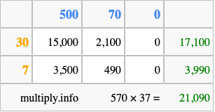 Below is an illustration showing you how to calculate 570 times 37 using the box method, using the instructions above.