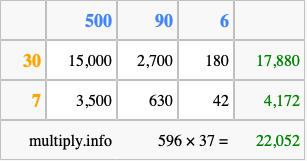 That's all there is to it! As you can see from the box above, the answer to 596 times 37 using the box method is 22,052.