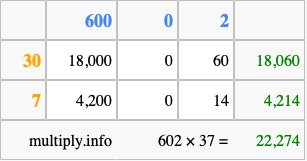 That's all there is to it! As you can see from the box above, the answer to 602 times 37 using the box method is 22,274.