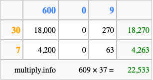 That's all there is to it! As you can see from the box above, the answer to 609 times 37 using the box method is 22,533.