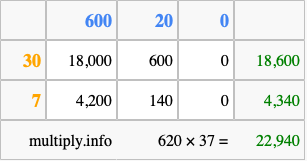 Finally, we add up all the sums we found in step 3 to get our final answer to 620 times 37.
