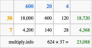 Finally, we add up all the sums we found in step 3 to get our final answer to 624 times 37.