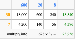 That's all there is to it! As you can see from the box above, the answer to 628 times 37 using the box method is 23,236.