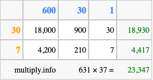 Below is an illustration showing you how to calculate 631 times 37 using the box method, using the instructions above.